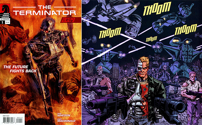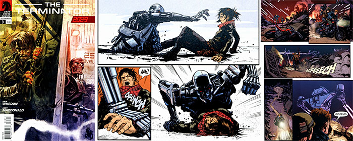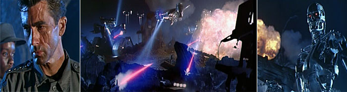 - บรรยากาศสงคราม มนุษย์ VS คนเหล็กTerminator ณ เมือง Los Angeles แห่งโลกอนาคต ปี 2029 (*รูปซ้าย ก็คือโฉมหน้า John Conner โลกอนาคต ใบหน้าเต็มไปด้วยร่องรอยของบาดแผลแห่งสงคราม!) ส่วนภาพแถวล่างเป็น บรรยากาศสงครามคนเหล็ก Terminator ปี 2029 เช่นกัน จากภาคหนังสือการ์ตูนชุด The Terminator 2029 -